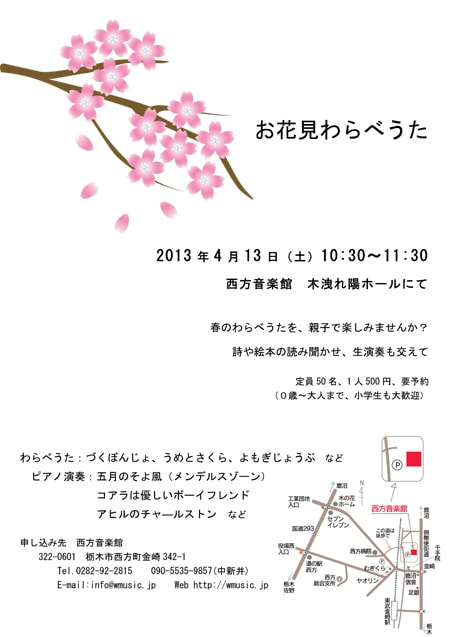 過去のコンサート&イベント 2025 2024 2023 2022 2021 2020 2019 2018 2017 2016 2015 HOME > 2013年のコンサート&イベント > お花見わらべうた お花見わらべうた 春のわらべうたを、親子でたのしみませんか?詩や絵本の読み聞かせ、生演奏も交えて。 日時 2013年4月13日(土)10:30〜11:30 チケット 500円(要予約)※定員50名。0歳から大人まで、小学生も大歓迎。 場所 西方音楽館 曲目 わらべうた:づくぼんじょ、うめとさくら、よもぎじょうぶ などピアノ演奏:五月のそよ風(メンデルスゾーン)、コアラは優しいボーイフレンド、アヒルのチャ―ルストン など お問い合わせ ■西方音楽館TEL:0282-92-2815 小学生の部 日時 2013年4月13日(土)13:00〜 チケット 500円(要予約)※定員20名。小学生限定 場所 西方音楽館 曲目 わらべうた:うめとさくら、よもぎじょうぶ などピアノ演奏:五月のそよ風(メンデルスゾーン)、コアラは優しいボーイフレンド、アヒルのチャ―ルストン など お問い合わせ ■西方音楽館TEL:0282-92-2815 篤志の方々のご寄付により、フォルテ・ピアノが、西方音楽館 木洩れ陽ホールに設置されました。 クリストファー・クラーク1994年製 (A.ヴァルター1795年モデル) 故小島芳子愛用の名器 まず、西方音楽館 木洩れ陽アップルパイ を販売します。 「3本足のルー」が完成しました。ルーが教えてくれたことは、「子供が育つ」ということ、さらに「人間が育つ」ということへの、励ましとヒントになりました。 日本モーツァルト愛好会のホームページ