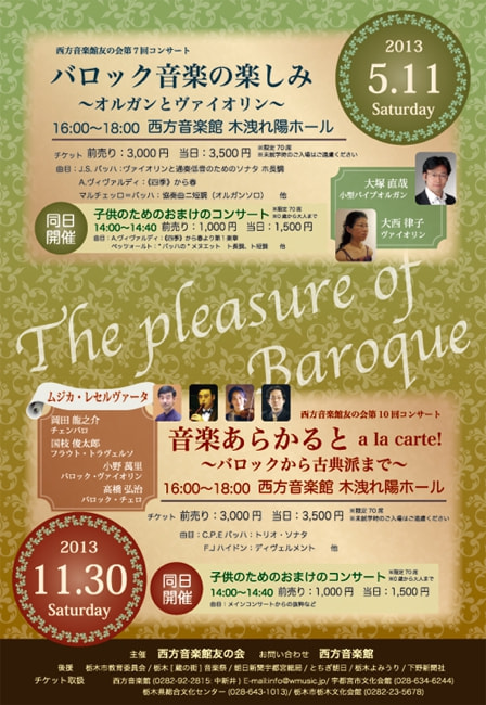 | 曲目 | J.S.バッハ:主よ、人の望みの喜びよ(カンタータ第147番から) バード:ソールズベリー伯爵のパヴァーヌ(オルガン独奏) ヴィヴァルディ:春 Allegro-Largo e pianissimo-Allegro(または、ソネットを載せる) ~みんなで踊ってみよう!~ペッツォールトのメヌエット コレルリ:フォリア |