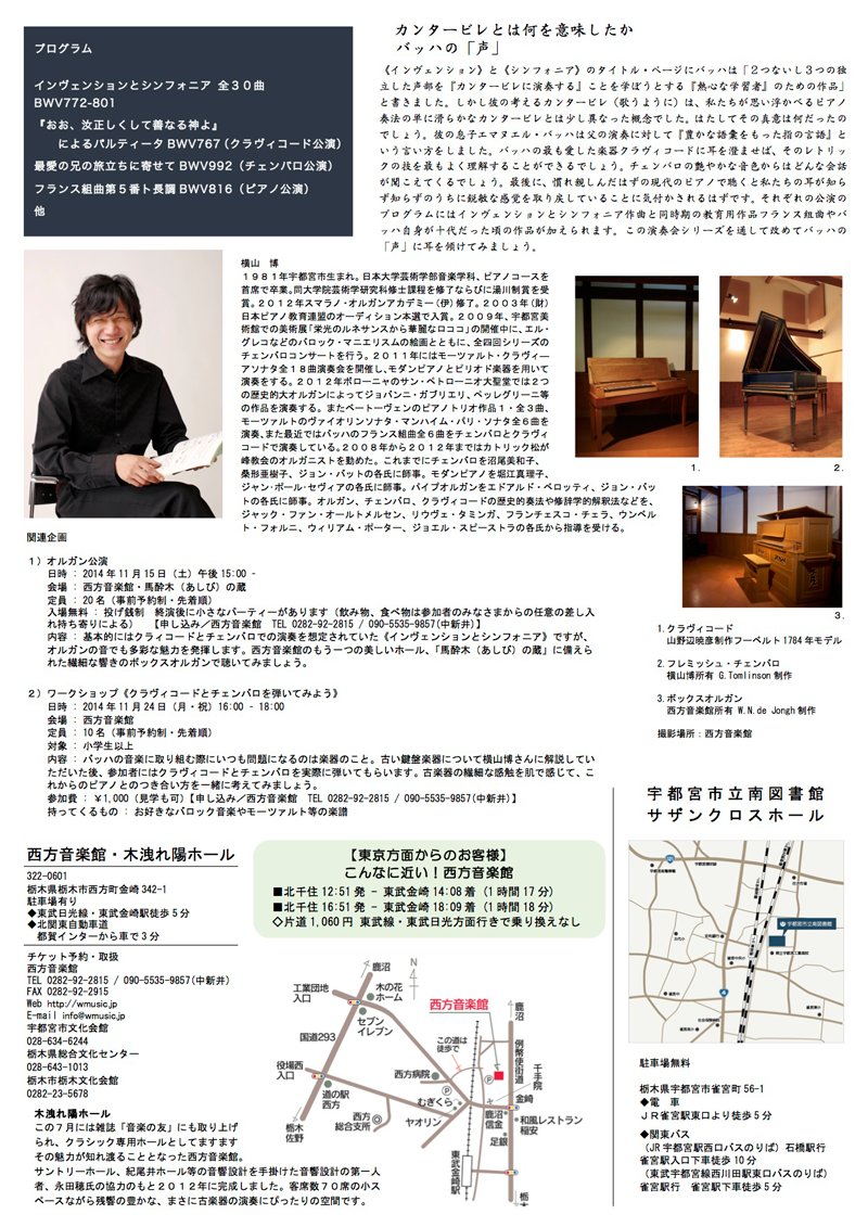 横山博バッハ・リサイタルでは、クラヴィコード、チェンバロ、ピアノで、J.S.バッハのインヴェンションとシンフォニアを弾き分けます。3つの公演を体験すると、楽器による音楽の違い、演奏法の違いを、体験することができます(3公演通し券有)。チェンバロ公演だけ、宇都宮南図書館サザンクロスホールでもコンサートを行います。この宇都宮公演は通し券に含まれません。友の会会員の方は、西方音楽館までお申し込みください。