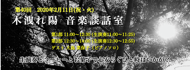 | 日時 | 第40回 2020年2月11日(祝・火) 11:00~14:00までの間、演奏中以外は、いつでも出入り自由 昼食の持ち込み可 それぞれ定員22名・要予約 |