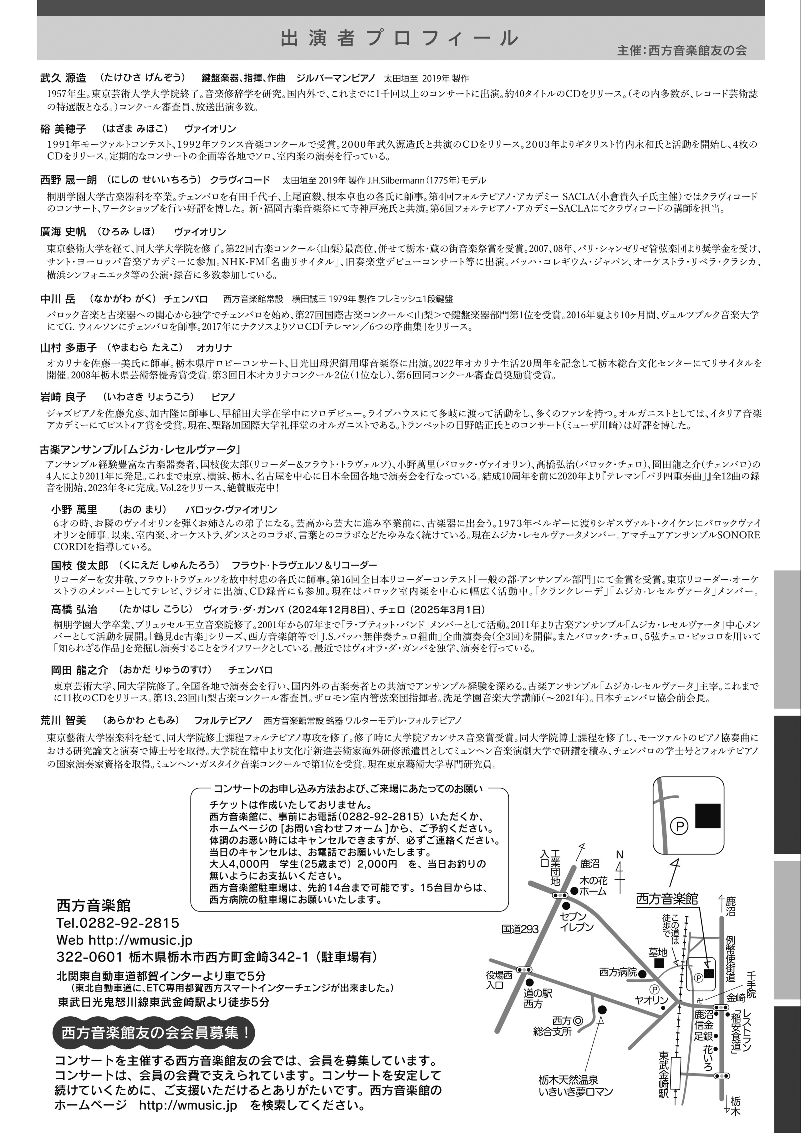 | お申し込み方法及びご来場にあたってのお願い | 1. チケットは作成いたしておりません。西方音楽館に、事前にお電話(0282-92-2815)いただくか、ホームページのお問い合わせフォームから、ご予約ください。 2. 大人4,000円 学生(25歳まで)2,000円 を、当日お釣りの無いようにお支払いください。 3. 西方音楽館駐車場は、先約14台まで可能です。15台目からは、西方病院の駐車場にお願いいたします。 |