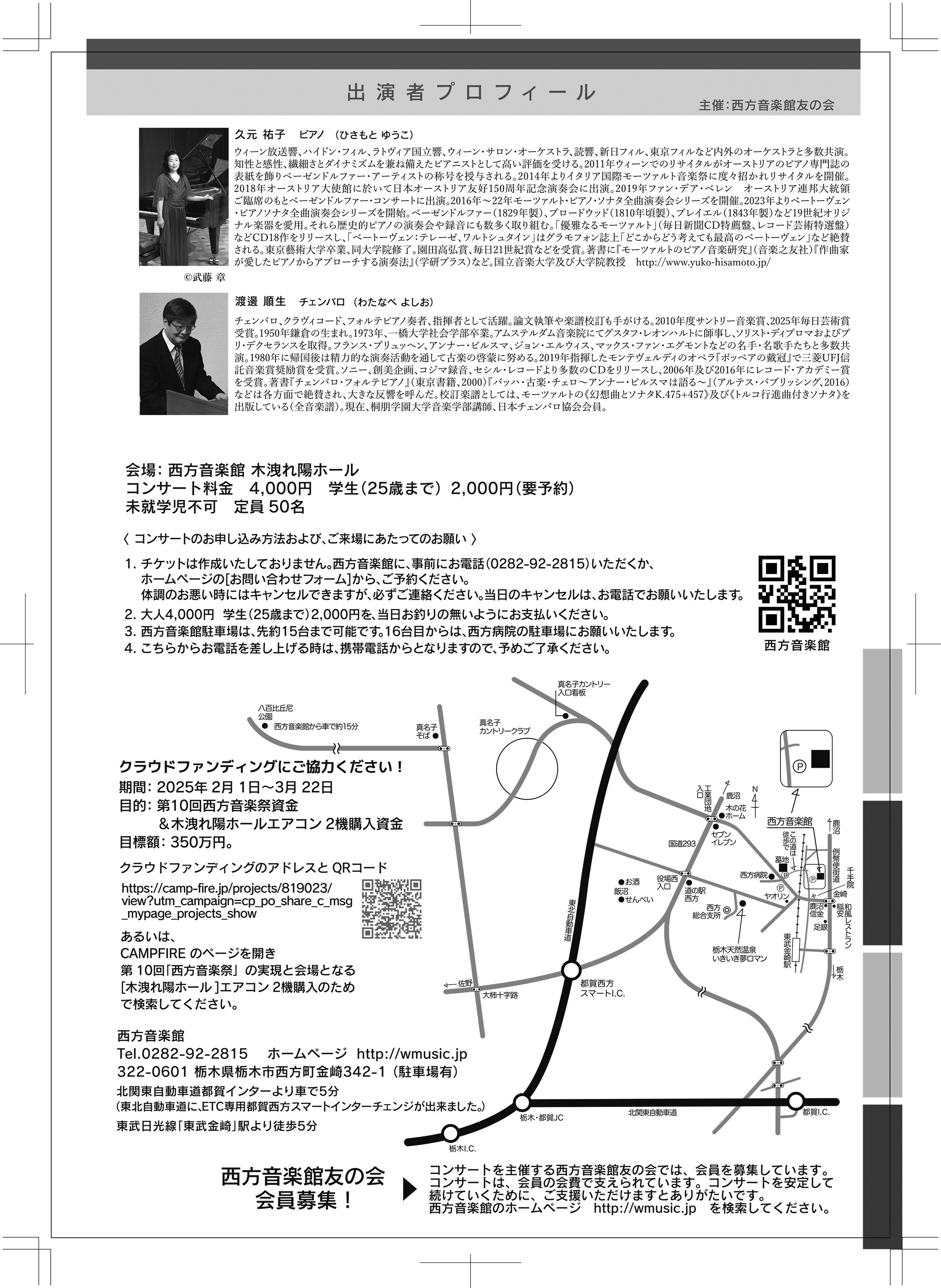 | お申し込み方法及びご来場にあたってのお願い | 1. チケットは作成いたしておりません。西方音楽館に、事前にお電話(0282-92-2815)いただくか、ホームページのお問い合わせフォームから、ご予約ください。 2. 大人4,000円 学生(25歳まで)2,000円 を、当日お釣りの無いようにお支払いください。 3. 西方音楽館駐車場は、先約14台まで可能です。15台目からは、西方病院の駐車場にお願いいたします。 |