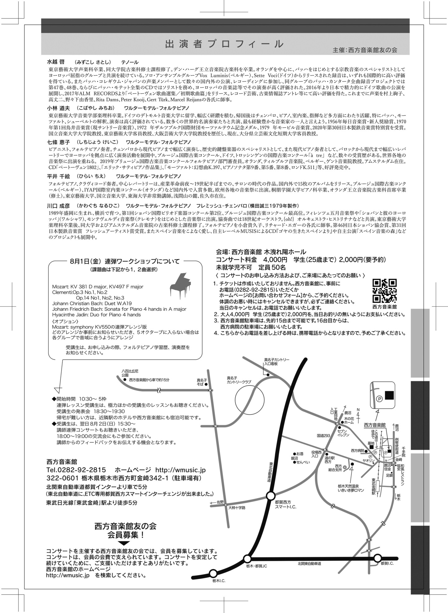 | お申し込み方法及びご来場にあたってのお願い | 1. チケットは作成いたしておりません。西方音楽館に、事前にお電話(0282-92-2815)いただくか、ホームページのお問い合わせフォームから、ご予約ください。 2. 大人4,000円 学生(25歳まで)2,000円 を、当日お釣りの無いようにお支払いください。 3. 西方音楽館駐車場は、先約14台まで可能です。15台目からは、西方病院の駐車場にお願いいたします。 |