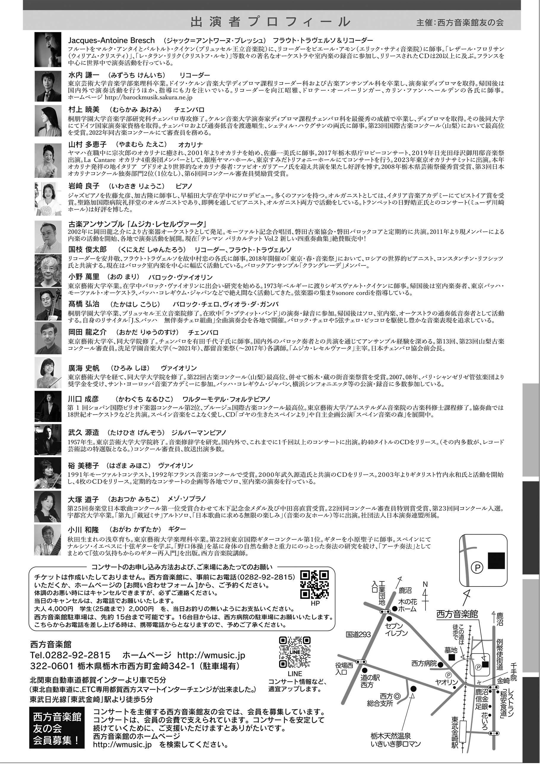 | お申し込み方法及びご来場にあたってのお願い | 1. チケットは作成いたしておりません。西方音楽館に、事前にお電話(0282-92-2815)いただくか、ホームページのお問い合わせフォームから、ご予約ください。 2. 大人4,000円 学生(25歳まで)2,000円 を、当日お釣りの無いようにお支払いください。 3. 西方音楽館駐車場は、先約14台まで可能です。15台目からは、西方病院の駐車場にお願いいたします。 |
