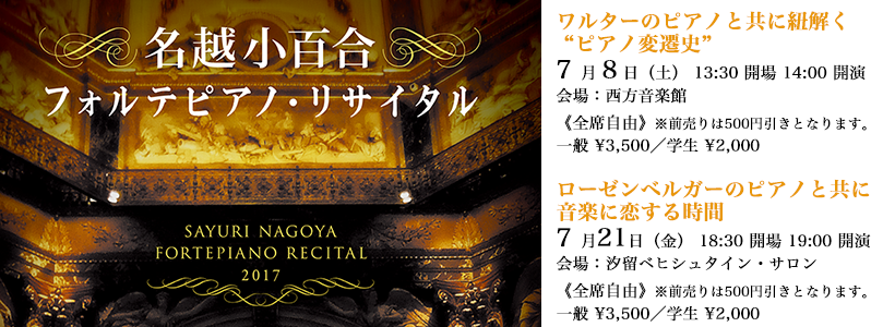 | 公演 | ワルターのピアノと共に紐解く“ピアノ変遷史” 2017年7月8日(土) 13:30開場 14:00開演 会場:西方音楽館 ローゼンベルガーのピアノと共に 音楽に恋する時間 2017年7月21日(金) 18:30開場 19:00開演 会場:汐留ベヒシュタイン・サロン |