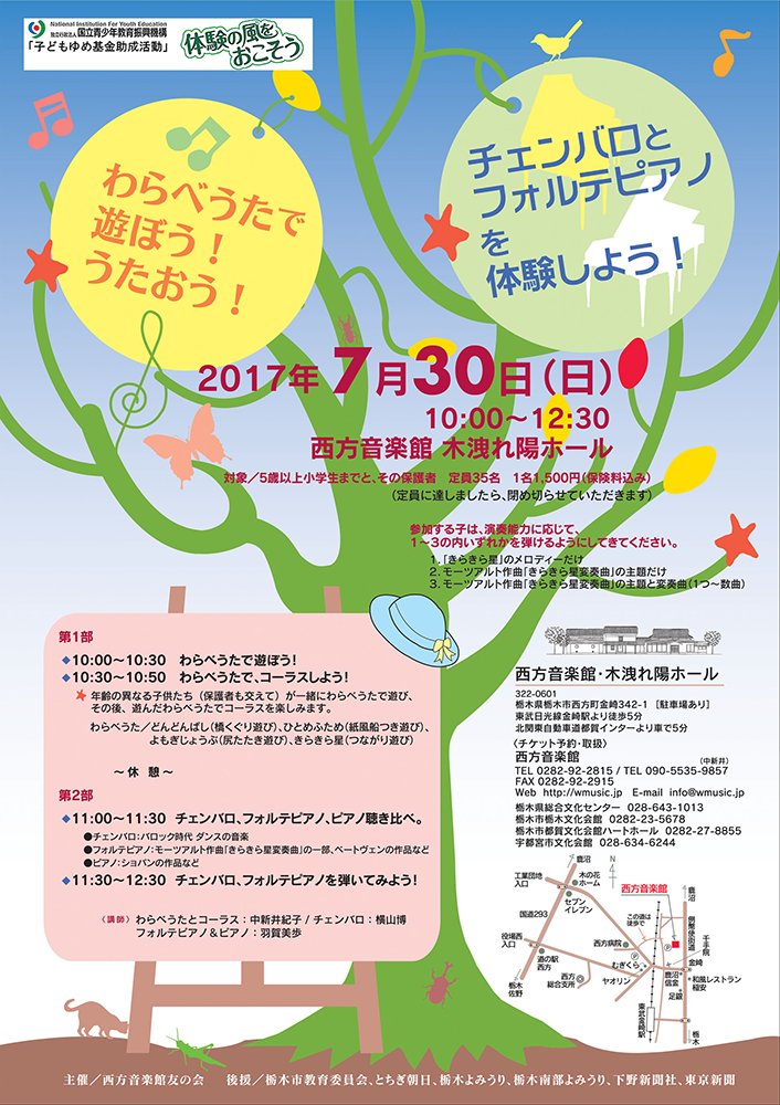 | 日時 | 2017年7月30日(日) 10:00〜12:30 場所:西方音楽館 木洩れ陽ホール |