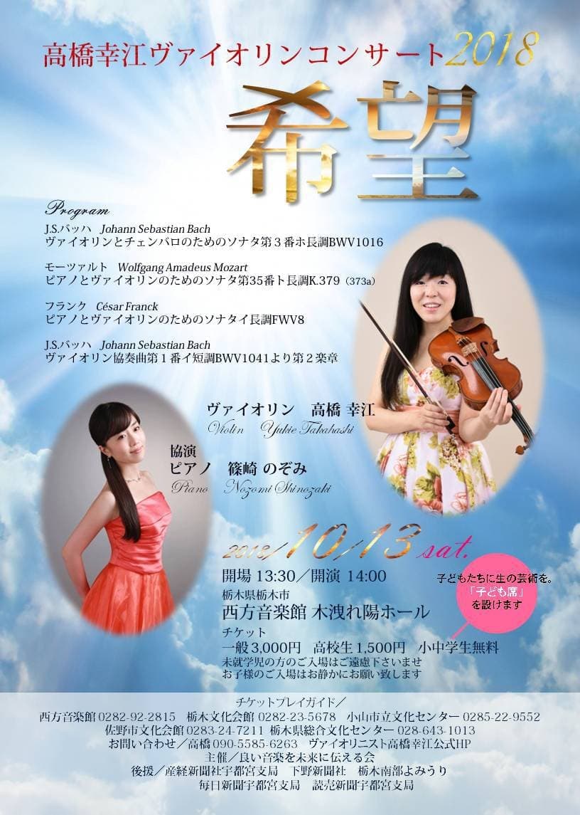 このコンサートは、「希望」というテーマを根幹に、プログラムを構成したコンサートです。希望を伝える音楽、希望を込めた音楽、希望を宿した音楽、それぞれの作曲家の方の心の世界から無言に現れる「希望の光」を、ヴァイオリニストの高橋幸江とピアニストの篠崎のぞみとで協演し表現したいと思っています。