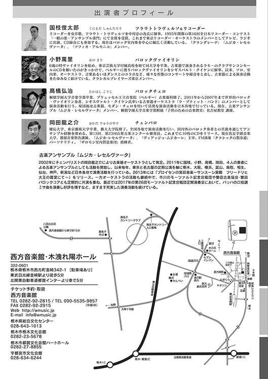 | お問い合わせ・チケット取扱 | ■西方音楽館 TEL:0282-92-2815 ■栃木県総合文化センター TEL:028-643-1013 ■宇都宮市文化会館 TEL:028-634-6244 ■栃木市栃木文化会館 TEL:0282-23-5678 ■栃木市都賀文化会館ハートホール TEL:0282-27-8855 |