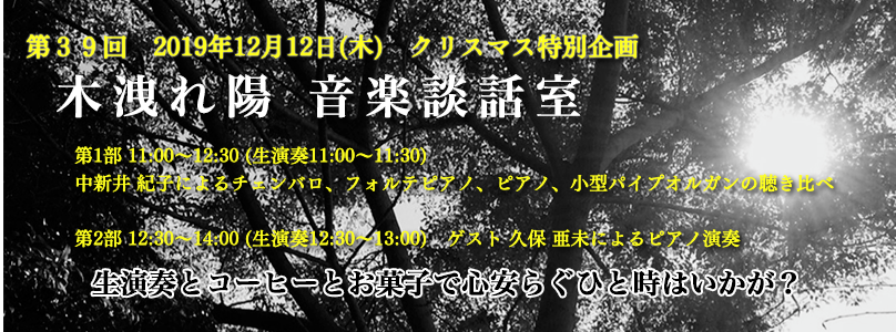 | 日時 | 第39回 2019年12月12日(木) 11:00~14:00までの間、演奏中以外は、いつでも出入り自由 昼食の持ち込み可 それぞれ定員20名・要予約 |