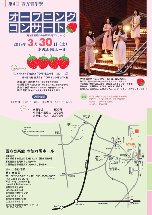 | お問い合わせ・チケット取扱 | ■西方音楽館 TEL:0282-92-2815 ■栃木県総合文化センター TEL:028-643-1013 ■宇都宮市文化会館 TEL:028-634-6244 ■栃木市栃木文化会館 TEL:0282-23-5678 ■栃木市都賀文化会館ハートホール TEL:0282-27-8855 |