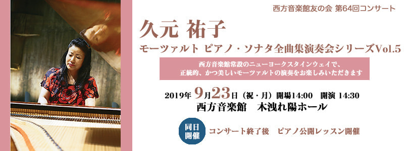 モーツァルトの専門家でもあるピアニスト久元祐子のモーツアルト ピアノソナタ 全曲演奏会シリーズの第5回目。西方音楽館常設のニューヨークスタインウェイで、正統的、かつ美しいモーツァルトの演奏をお楽しみいただきます。コンサート後、いつものように公開レッスンも行います。この度は、日本モーツァルト愛好会にも、ご後援いただきました。