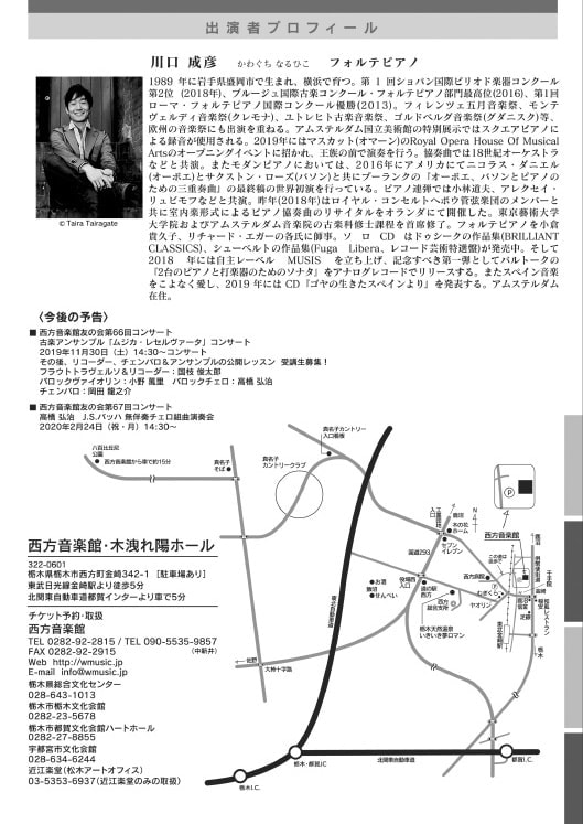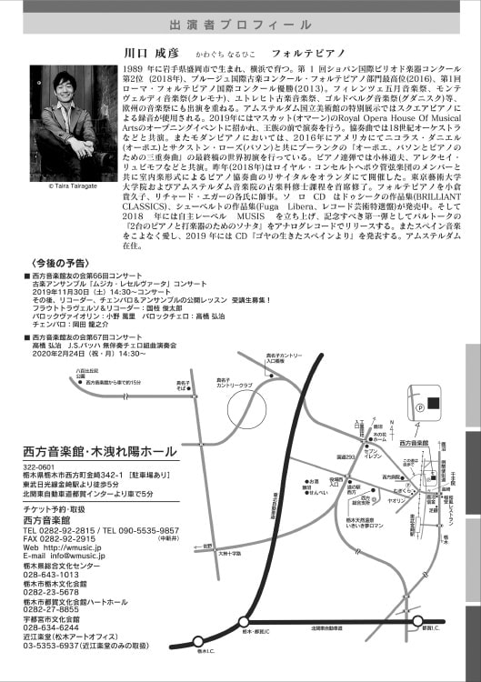 | お申込 | ■西方音楽館 TEL:0282-92-2815 ■栃木県総合文化センター TEL:028-643-1013 ■宇都宮市文化会館 TEL:028-634-6244 ■栃木市栃木文化会館 TEL:0282-23-5678 ■栃木市都賀文化会館ハートホール TEL:0282-27-8855 ■近江楽堂(松木アートオフィス) TEL;03-5353-6937(近江楽堂のみの取り扱い) |