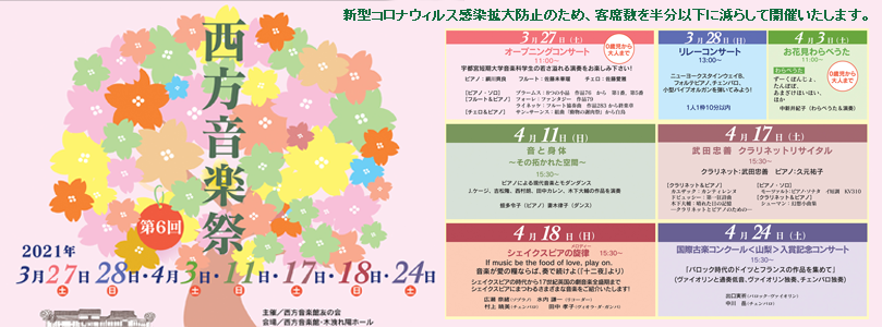 | お願い | ・新型コロナウイルス感染拡大防止のため、チケットは作成いたしません。西方音楽館に、事前にお電話かメールでご予約いただき、指定の口座にお振込みいただくことで、ご予約確定といたします。 ・当日は、ご本人確認が出来るものをお持ちください。(運転免許証、健康保険証、学生証等) ・館内では、常時マスクをご着用ください。 |