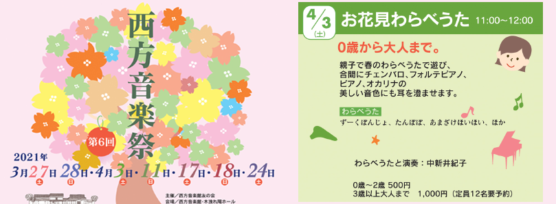 | 日時 | 2021年4月3日(土) 11:00〜12:00 場所:西方音楽館 木洩れ陽ホール |