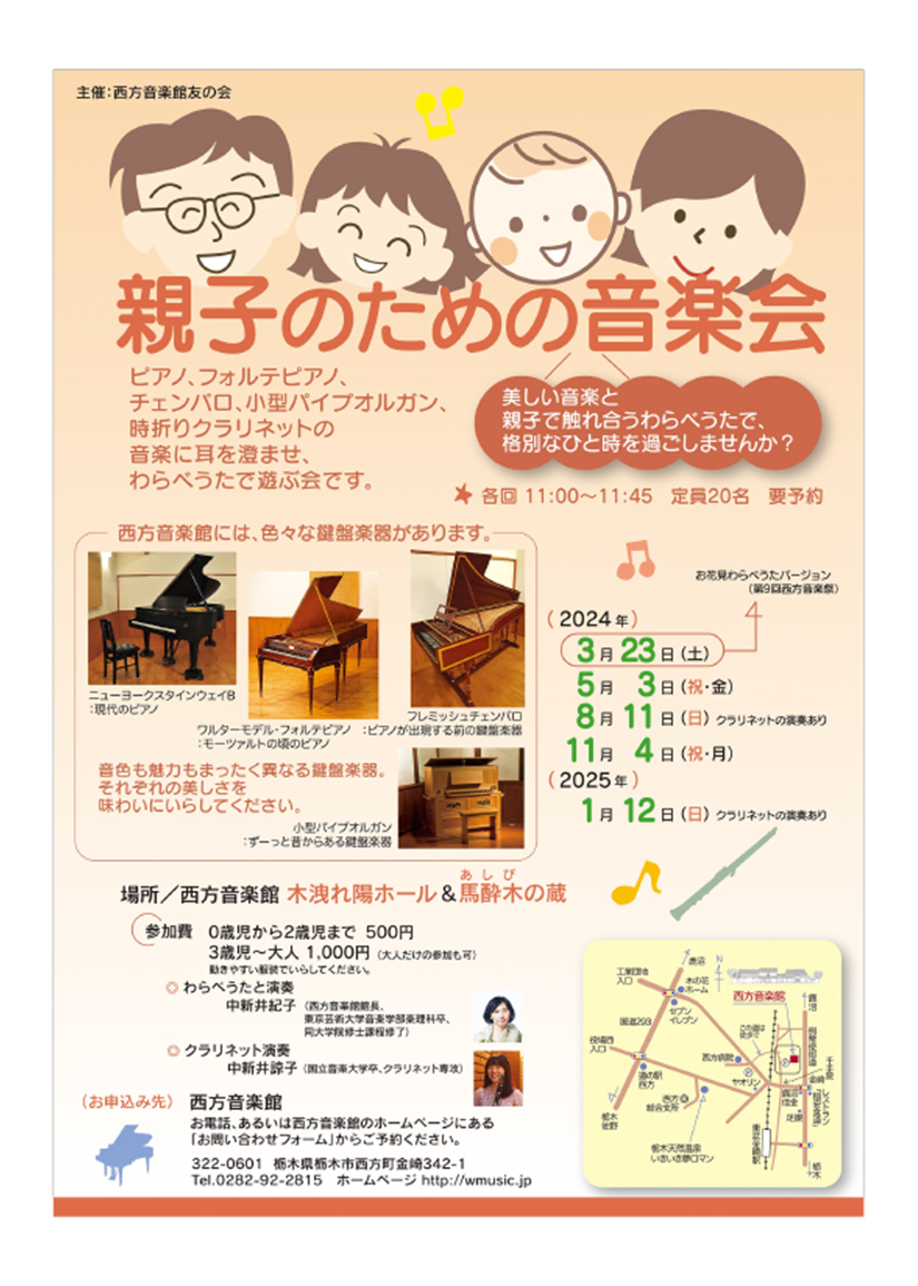 | お申込み | 西方音楽館に、事前にお電話(0282-92-2815)いただくか、ホームページの お問い合わせフォーム から、ご予約ください。 |