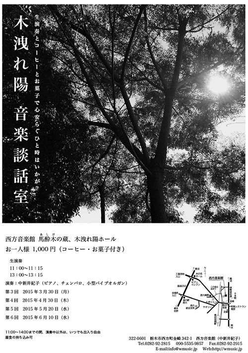 過去のコンサート&イベント 2025 2024 2023 2022 2021 2020 2019 2018 2017 2016 2015 HOME > 2015年のコンサート&イベント > 木洩れ陽音楽談話室3_6 木洩れ陽 音楽談話室 生演奏とコーヒーとお菓子で心安らぐひと時はいかが? 演奏 中新井 紀子(ピアノ、チェンバロ、小型パイプオルガン) 日時 第3回 2015年3月30日(月)第4回 2015年4月30日(木)第5回 2015年5月20日(水)第6回 2015年6月10日(水)各回ともに11:00〜14:00 生演奏 11:00〜11:15/13:00〜13:15 参加費 お一人様1,000円(コーヒー、お菓子付き) 場所 西方音楽館 馬酔木の蔵、木洩れ陽ホール 備考 演奏中以外、出入り自由昼食の持ち込み可 お申込み ■西方音楽館TEL:0282-92-2815 篤志の方々のご寄付により、フォルテ・ピアノが、西方音楽館 木洩れ陽ホールに設置されました。 クリストファー・クラーク1994年製 (A.ヴァルター1795年モデル) 故小島芳子愛用の名器 まず、西方音楽館 木洩れ陽アップルパイ を販売します。 「3本足のルー」が完成しました。ルーが教えてくれたことは、「子供が育つ」ということ、さらに「人間が育つ」ということへの、励ましとヒントになりました。 日本モーツァルト愛好会のホームページ