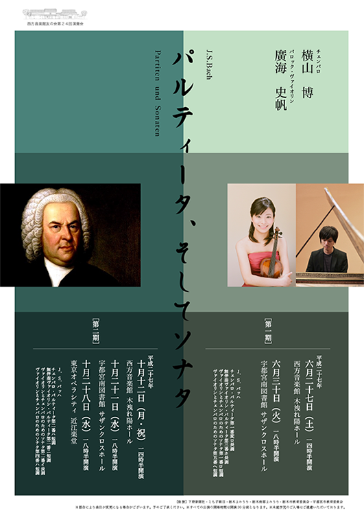 | プログラム | J.S.バッハ チェンバロ・パルティータ第一番変ロ長調 無伴奏ヴァイオリン・パルティータ第三番ホ長調 ヴァイオリンとチェンバロのためのソナタ第一番ロ短調 ヴァイオリンとチェンバロのためのソナタ第五番ヘ短調 |