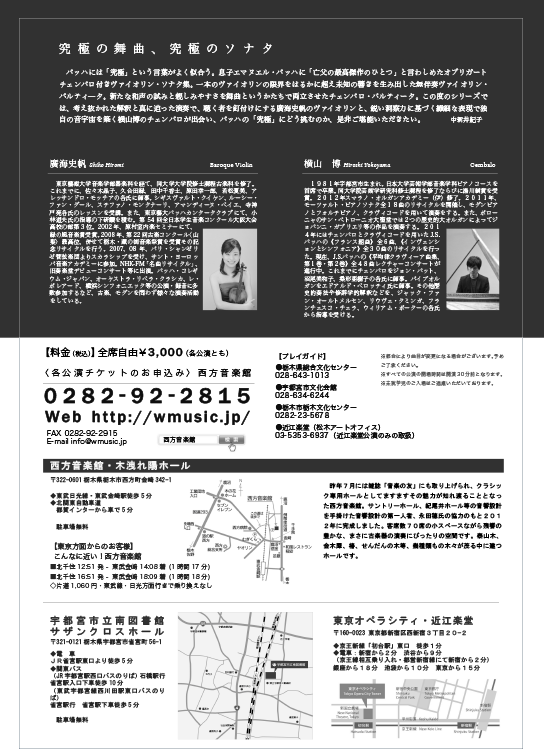 | お申込 | ■西方音楽館 ※会員の方はこちらまで TEL:0282-92-2815 ■宇都宮市文化会館 TEL:028-634-6244 (9:00~19:00) ■栃木県総合文化センター TEL:028-643-1013 ■宇都宮市文化会館 TEL:028-634-6244 ■栃木市栃木文化センター TEL:0282-23-5678 ■近江楽堂(松木アートオフィス) TEL:03-5353-6937(近江楽堂公演のみの取扱) |