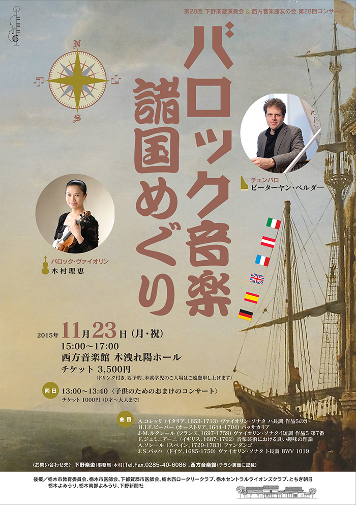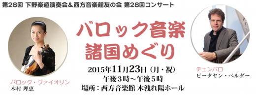 | プログラム | A.コレッリ(イタリア、1653-1713) ヴァイオリン・ソナタ ハ長調 作品5の3 H.I.F.ビーバー(オーストリア、1644-1704) パッサカリア J-M.ルクレール(フランス、1697-1759) ヴァイオリン・ソナタ イ短調 作品5 第7番 F.ジェミニアー二(イギリス、1687-1762) 音楽芸術における良い趣味の理論 A.ソレール(スペイン、1729-1783) ファンダンゴ J.S.バッハ(ドイツ、1685-1750) ヴァイオリン・ソナタ ト長調 BWV 1019 |