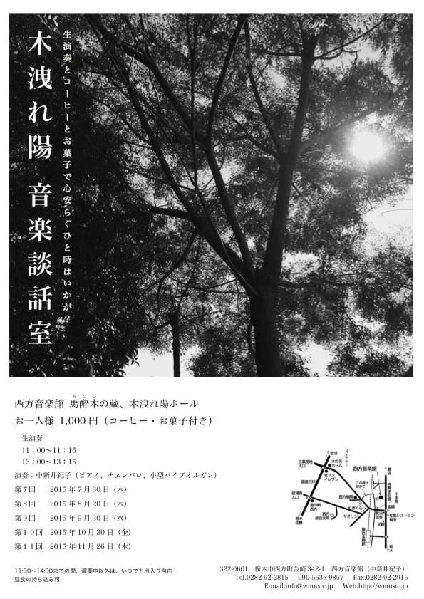 第8回 2015年8月20日(木) 第9回 2015 年9 月30 日(水) 第10回 2015 年10 月30 日(金) 第11回 2015 年11 月26 日(木) 各回ともに11:00~14:00までの間、演奏中以外は、いつでも出入り自由昼食の持ち込み可 |