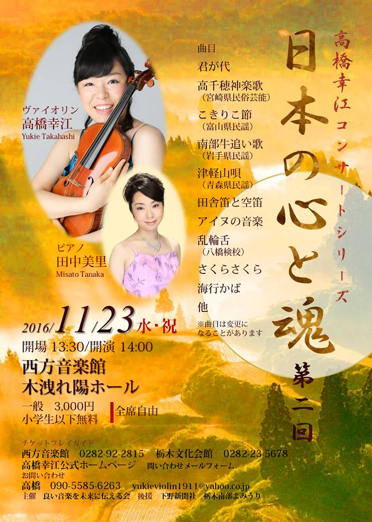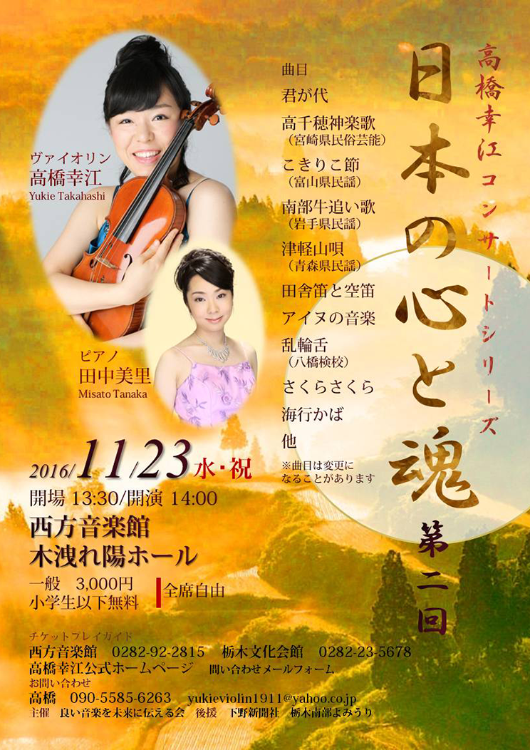 | お申込 | ■西方音楽館 ※会員の方はこちらまで TEL:0282-92-2815 ■栃木市栃木文化会館 TEL:0282-23-5678 ■高橋幸江公式ホームページ TEL:090-5585-6263(高橋) E=mail:yukieviolin1911@yahoo.co.jo |