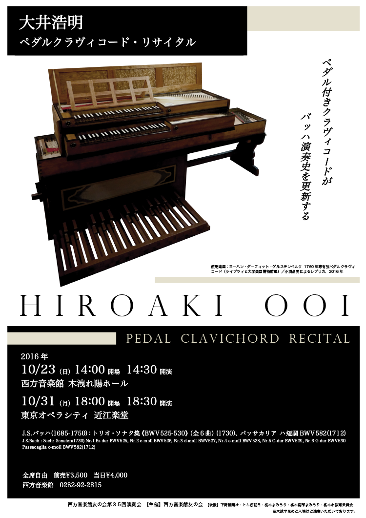 | 日時、会場 | 10月23日(日)14:00 開場 14:30 開演 西方音楽館 木洩れ陽ホール 10月31日(月)18:00 開場 18:30 開演 東京オペラシティ 近江楽堂 |