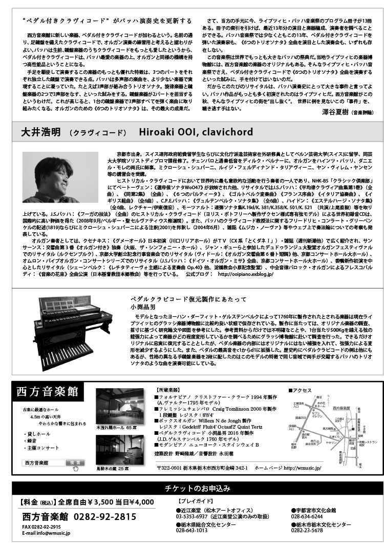 | お申込 | ■西方音楽館 ※会員の方はこちらまで TEL:0282-92-2815 ■近江楽堂(松木アートオフィス) 03-5353-6937(近江楽堂公演のみの取扱) ■栃木県総合文化センター TEL:028-643-1013 ■宇都宮市文化会館 TEL:028-634-6244 ■栃木市栃木文化センター TEL:0282-23-5678 |