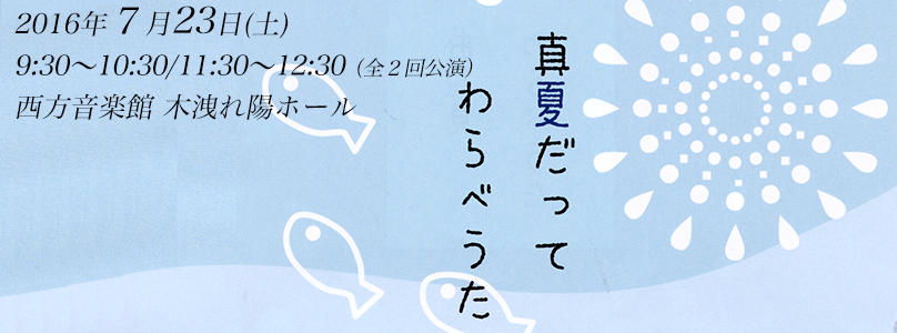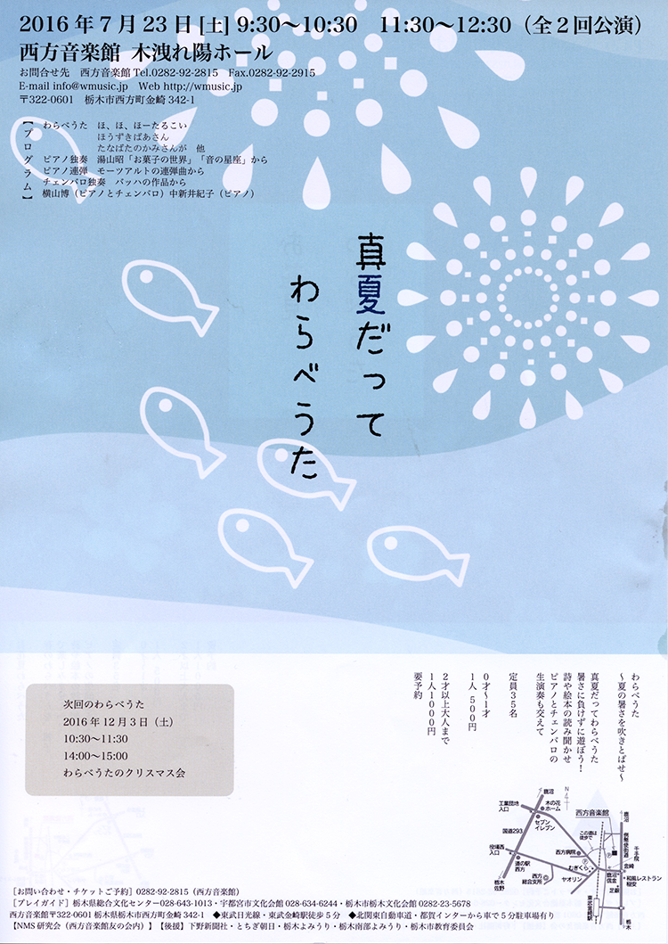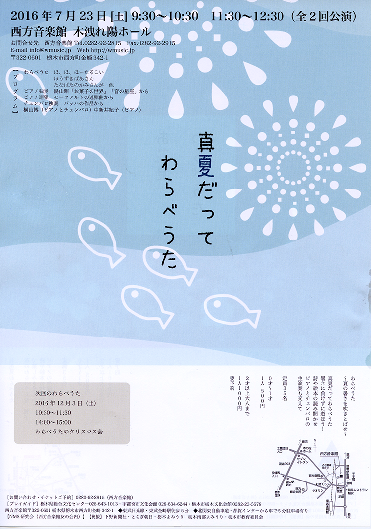 過去のコンサート&イベント 2025 2024 2023 2022 2021 2020 2019 2018 2017 2016 2015 HOME > 2016年のコンサート&イベント > 真夏だってわらべうた 真夏だってわらべうた 真夏だってわらべうた 暑さに負けずに遊ぼう! 詩や絵本の読み聞かせ ピアノとチェンバロの生演奏も交えて 演奏 中新井 紀子(ピアノ)横山 博(ピアノ、チェンバロ) 日時 2016年7月23日(土)9:30~10:30/11:30〜12:30(全2回公演)定員35名・要予約 参加費 0才〜1才 一人500円2才〜大人まで 一人1,000円 場所 西方音楽館 木洩れ陽ホール プログラム わらべうたほ、ほ、ほーたるこいほうずきばあさんたなばたのかみさんが 他ピアノ独奏湯山昭「お菓子の世界」「音の星座」からピアノ連弾モーツアルトの連弾曲からチェンバロ独奏バッハの作品から お申込み ■西方音楽館TEL:0282-92-2815 篤志の方々のご寄付により、フォルテ・ピアノが、西方音楽館 木洩れ陽ホールに設置されました。 クリストファー・クラーク1994年製 (A.ヴァルター1795年モデル) 故小島芳子愛用の名器 まず、西方音楽館 木洩れ陽アップルパイ を販売します。 「3本足のルー」が完成しました。ルーが教えてくれたことは、「子供が育つ」ということ、さらに「人間が育つ」ということへの、励ましとヒントになりました。 日本モーツァルト愛好会のホームページ