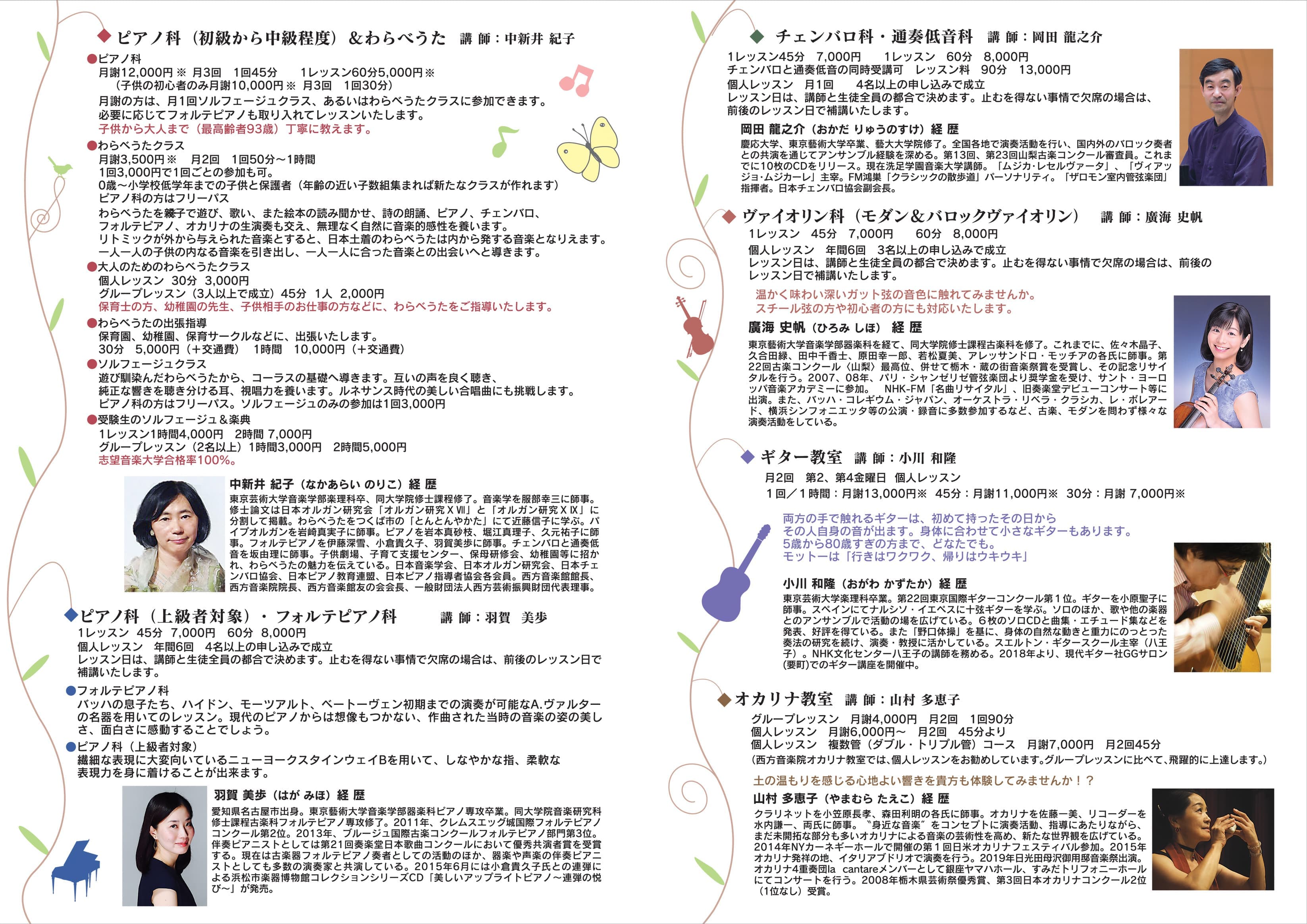 ピアノ科、チェンバロ科、ヴァイオリン科(モダン及びバロック)、作曲教室、わらべうた教室、オカリナ教室、ギター教室