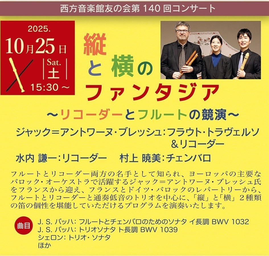 フルートとリコーダー両方の名手として知られ、ヨーロッパの主要なバロック・オーケストラで活躍するジャック=アントワーヌ・ブレッシュ氏をフランスから迎え、フランスとドイツ・バロックのレパートリーから、フルートとリコーダーと通奏低音のトリオを中心に、「縦」と「横」2種類の笛の個性を堪能していただけるプログラムを演奏いたします。