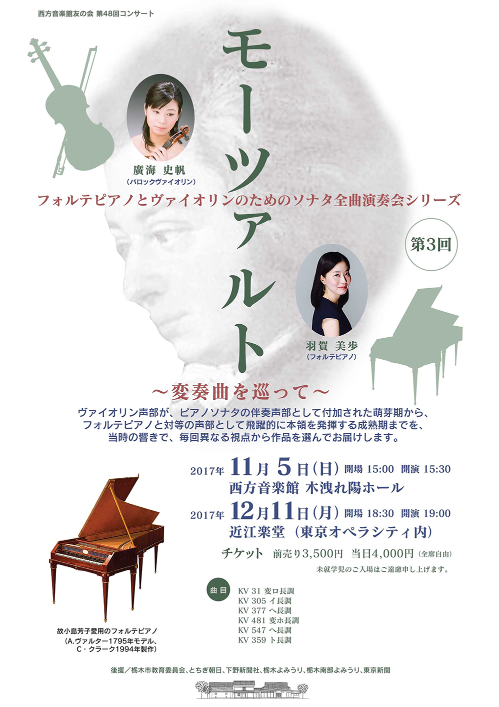 | 場所日時 | 2017年11月5日(日) 開場15:00 開演15:30 場所:西方音楽館 木洩れ陽ホール 2017年12月11日(月) 開場18:30 開演19:00 場所:近江楽堂(東京オペラシティ内) |