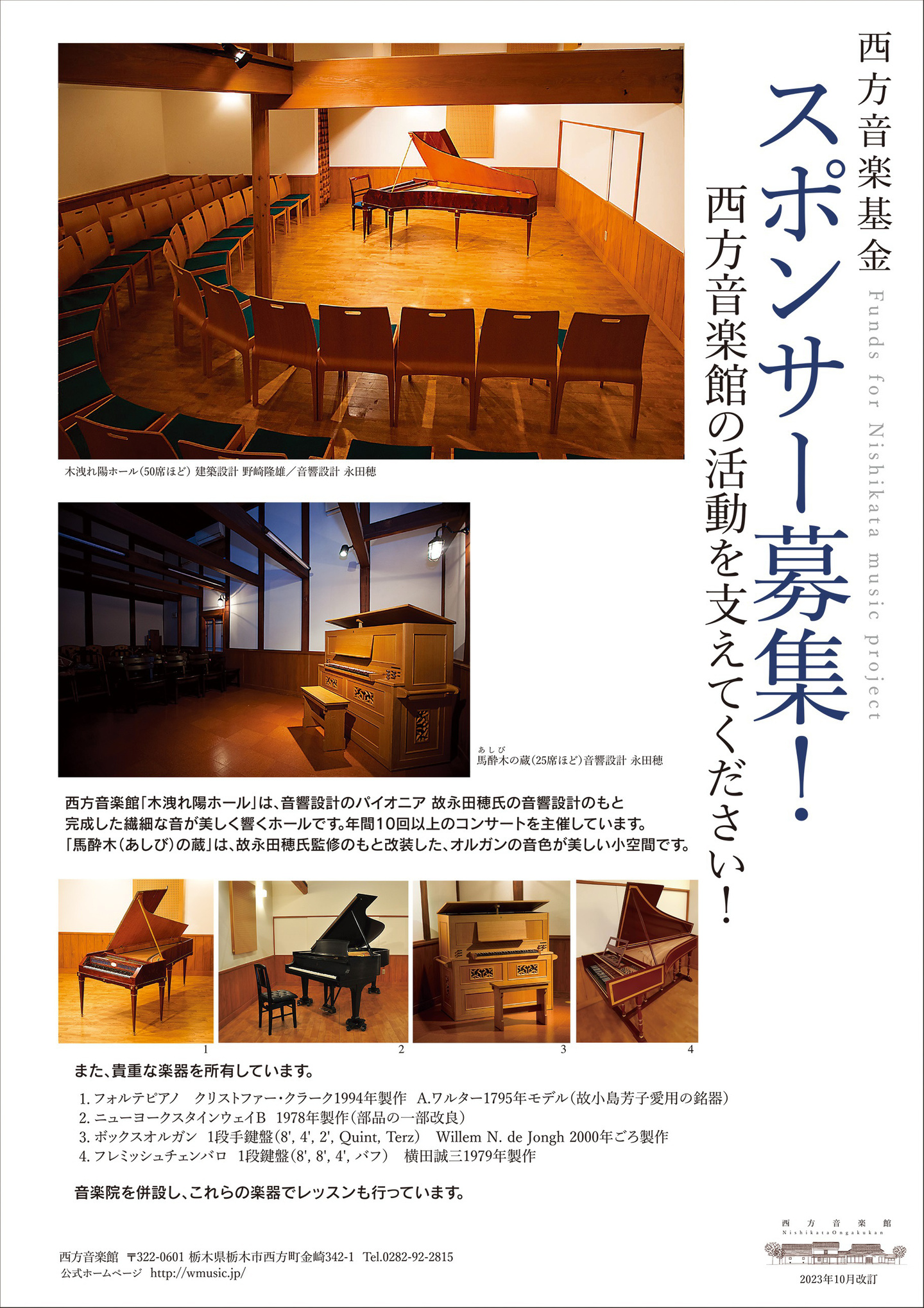 西方音楽館は開館以来、多くのご支援を賜ってまいりました。2012年2月以降は、[木洩れ陽ホール(約65席)] と [馬酔木の蔵(約30席)] 2つのホールをリニューアル・オープンし、演奏会の他に、西方音楽院を開校しピアノ科、チェンバロ科、作曲教室、ギター教室、オカリナ教室、わらべうた教室、講習会、講演会などの活動を新たに展開してきました。コンサートや音楽教室に活用される [木洩れ陽ホール] は音がとても美しく響き、とりわけ古楽に向いた音響であるという定評を得ています。2016年4月には非営利の財団法人「一般財団法人西方芸術振興財団」を立ち上げ、フォルテピアノやクラヴィコードなどのご寄付をいただきました。