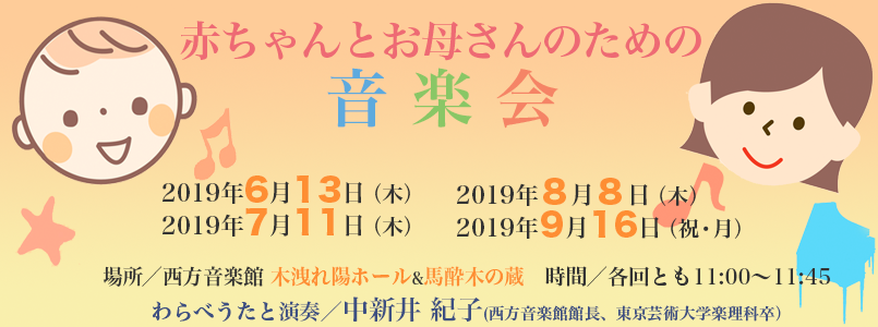 わらべうたを歌って、お母さんと一緒に遊んだり、ピアノ、フォルテピアノ、チェンバロ、小型パイプオルガン、オカリナの音楽に耳を澄ませたり、お母さんが子守唄を覚えたり、親子で音楽で遊ぶ会です。お父さん、おばあちゃん、おじいちゃん、お兄ちゃん、お姉ちゃんの参加も歓迎します。