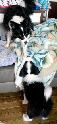追いかけっこをしたり、じゃれあってプロレスをしたり、思い思いにやりたい放題。タオルを目の前にちらつかせると噛みつくので、我々と綱引き。毛布や段ボールの紙も大好きで、ナナとチャーリーで引っ張りっこをしたり、ク―とつとむで1枚の段ボール紙の奪い合いをしたり、大騒動になります。さすが、ボーダーコリー。走るのは仔犬でも速く、テーブルの下、椅子の下、長いソファーの上を、ビュンビュン駆け抜けていきます。