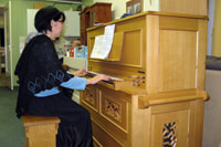 初め、ジャック先生が出物のボックスオルガンを弾き始めました。とても狭く、天井も低い場所に置かれていたせいか、どうもピンときません。もしかしたら、広い空間でならきれいに響くのでは?と思い、少しずつ、少しずつオルガンから離れつつ、響きの変化を確かめました。すると、離れれば離れるほどきれいに響くのです。ジャック先生も、この同じ楽器を広い教会で聴いた時は、とても美しかった、とおっしゃいます。水無子さんも、ストップを色々変えながら弾き始めました。私も、まずロマン派のオルガン曲を弾いてみました。そうしましたら、何だか、とても心地よいのです。コラール編曲を、コラールと伴奏に分けて、ストップを変えて弾いてみました(左右で異なる音色のストップが使えます)。これもうまくいきました。この楽器、小さいながら、古い時代のオルガン曲から、ロマン派の曲にまで対応できるのです。もちろん、現代曲にも対応できるでしょう。