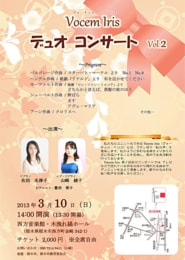 過去のコンサート&イベント 2025 2024 2023 2022 2021 2020 2019 2018 2017 2016 2015 HOME > 2013年のコンサート&イベント > Vocem Iris デュオ コンサート vol,2 過去のコンサート&イベント 2025 2024 2023 2022 2021 2020 2019 2018 2017 2016 2015 HOME > 2013年のコンサート&イベント > Vocem Iris デュオ コンサート vol,2 貸しホールイベント Vocem Iris デュオ コンサート vol,2 ヴォーチェムイリスの歌声をお楽しみください 出演者 Vocem Iris(ヴォーチェムイリス)ソプラノ:佐治 名津子メゾソプラノ:山﨑 綾子ピアノスト:豊田 華子 日時 2013年3月10日(日)14:00開演(13:30開場) チケット 2,000円 ※全席自由 場所 西方音楽館 木洩れ陽ホール お問い合わせ 山﨑綾子TEL:090-7214-6411 篤志の方々のご寄付により、フォルテ・ピアノが、西方音楽館 木洩れ陽ホールに設置されました。 クリストファー・クラーク1994年製 (A.ヴァルター1795年モデル) 故小島芳子愛用の名器 まず、西方音楽館 木洩れ陽アップルパイ を販売します。 「3本足のルー」が完成しました。ルーが教えてくれたことは、「子供が育つ」ということ、さらに「人間が育つ」ということへの、励ましとヒントになりました。 日本モーツァルト愛好会のホームページ