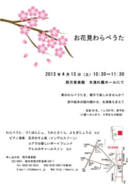 過去のコンサート&イベント 2025 2024 2023 2022 2021 2020 2019 2018 2017 2016 2015 HOME > 2013年のコンサート&イベント > お花見わらべうた お花見わらべうた 春のわらべうたを、親子でたのしみませんか?詩や絵本の読み聞かせ、生演奏も交えて。 日時 2013年4月13日(土)10:30〜11:30 チケット 500円(要予約)※定員50名。0歳から大人まで、小学生も大歓迎。 場所 西方音楽館 曲目 わらべうた:づくぼんじょ、うめとさくら、よもぎじょうぶ などピアノ演奏:五月のそよ風(メンデルスゾーン)、コアラは優しいボーイフレンド、アヒルのチャ―ルストン など お問い合わせ ■西方音楽館TEL:0282-92-2815 小学生の部 日時 2013年4月13日(土)13:00〜 チケット 500円(要予約)※定員20名。小学生限定 場所 西方音楽館 曲目 わらべうた:うめとさくら、よもぎじょうぶ などピアノ演奏:五月のそよ風(メンデルスゾーン)、コアラは優しいボーイフレンド、アヒルのチャ―ルストン など お問い合わせ ■西方音楽館TEL:0282-92-2815 篤志の方々のご寄付により、フォルテ・ピアノが、西方音楽館 木洩れ陽ホールに設置されました。 クリストファー・クラーク1994年製 (A.ヴァルター1795年モデル) 故小島芳子愛用の名器 まず、西方音楽館 木洩れ陽アップルパイ を販売します。 「3本足のルー」が完成しました。ルーが教えてくれたことは、「子供が育つ」ということ、さらに「人間が育つ」ということへの、励ましとヒントになりました。 日本モーツァルト愛好会のホームページ
