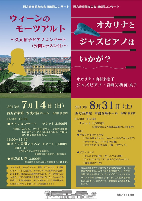 | チケット | ピアノコンサート 2,500円 ピアノ公開レッスン 1,500円 両方通し券 3,000円 ※両未就学児のご入場はご遠慮申し上げます。 |