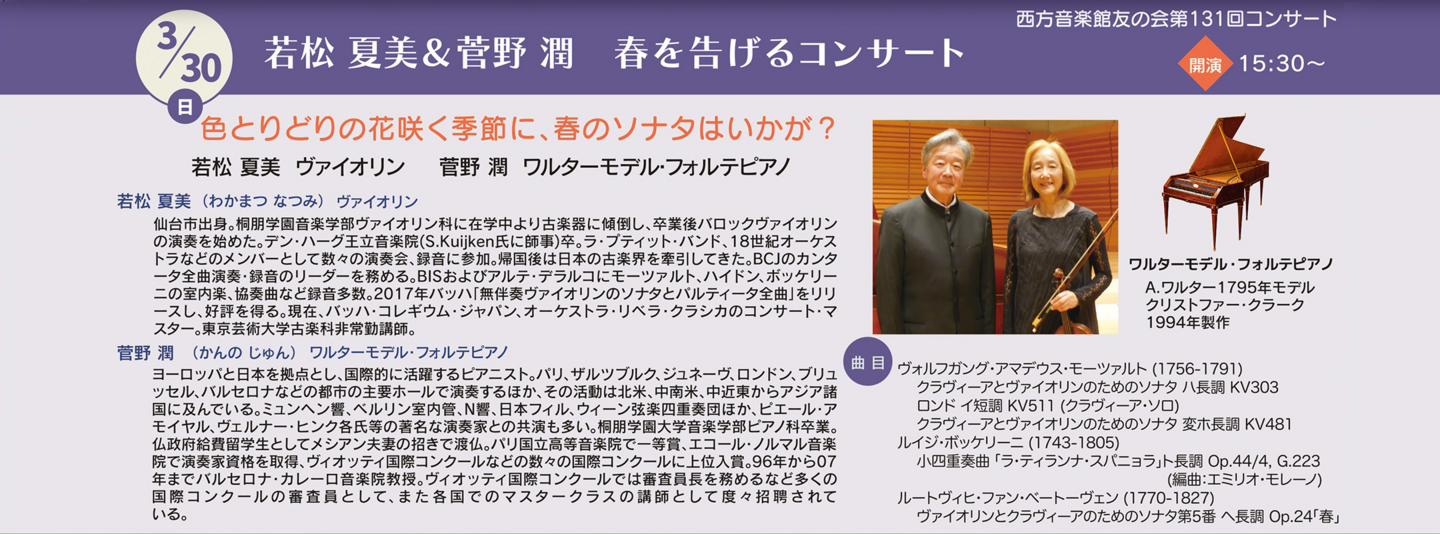 | 曲目 | ヴォルフガング・アマデウス・モーツァルト (1756-1791) クラヴィーアとヴァイオリンのためのソナタ ハ長調 KV303 ロンド イ短調 KV511 (クラヴィーア・ソロ) クラヴィーアとヴァイオリンのためのソナタ 変ホ長調 KV481 ルイジ・ボッケリーニ (1743-1805) 小四重奏曲「ラ・ティランナ・スパニョラ」ト長調 Op.44/4, G.223 (編曲:エミリオ・モレーノ) ルートヴィヒ・ファン・ベートーヴェン (1770-1827) ヴァイオリンとクラヴィーアのためのソナタ第5番 ヘ長調 Op.24「春」 |