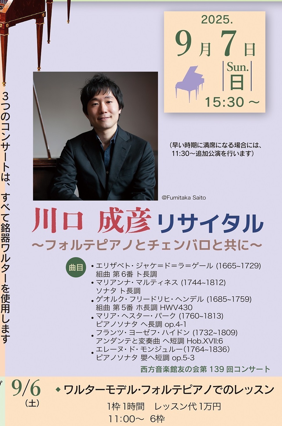 | 日時 | 2025年9月7日(日)15:30〜 西方音楽館 木洩れ陽ホール |