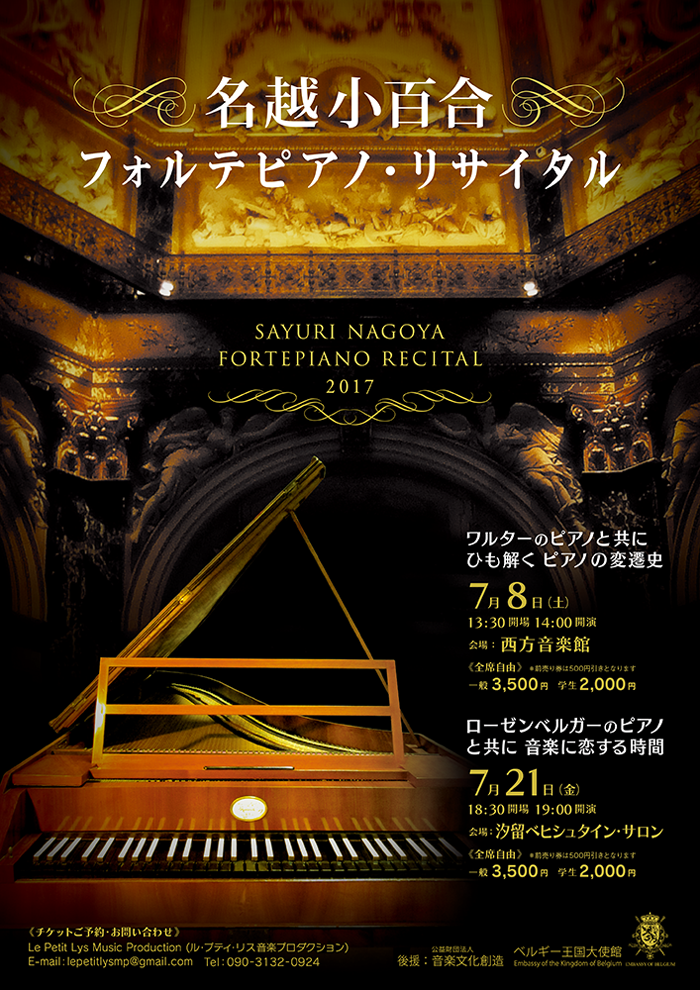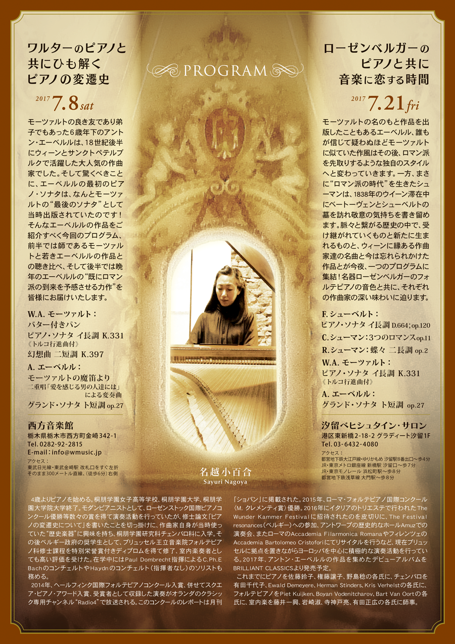 | 公演 | ワルターのピアノと共に紐解く“ピアノ変遷史” 2017年7月8日(土) 13:30開場 14:00開演 会場:西方音楽館 ローゼンベルガーのピアノと共に 音楽に恋する時間 2017年7月21日(金) 18:30開場 19:00開演 会場:汐留ベヒシュタイン・サロン |