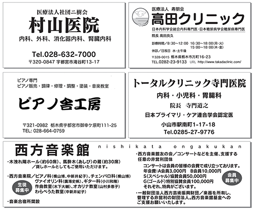 | お申込 | ■西方音楽館 ※会員の方はこちらまで TEL:0282-92-2815 ■栃木県総合文化センター TEL:028-643-1013 ■宇都宮市文化会館 TEL:028-634-6244 ■栃木市栃木文化会館 TEL:0282-23-5678 ■栃木市都賀文化会館ハートホール TEL:0282-27-8855 |