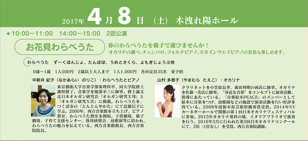 春のわらべうたを親子で遊びます。合間に、詩の朗誦・絵本の読み聞かせをオカリナの調べに乗せて行います。チェンバロ・フォルテピアノ・スタインウェイピアノの音色も聴くことができます。