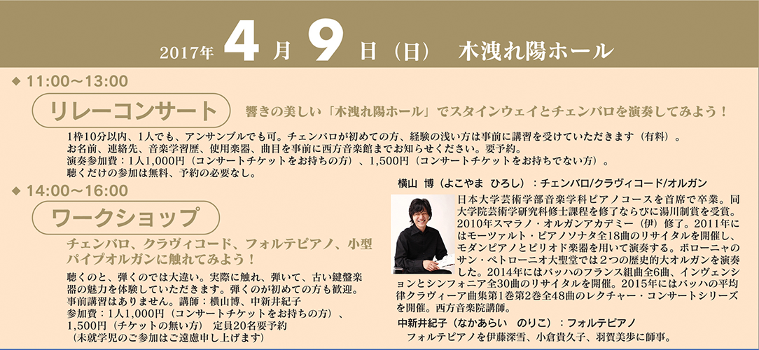 チェンバロが初めての方、経験の浅い方は、事前に講習を受けていただきます(有料)。