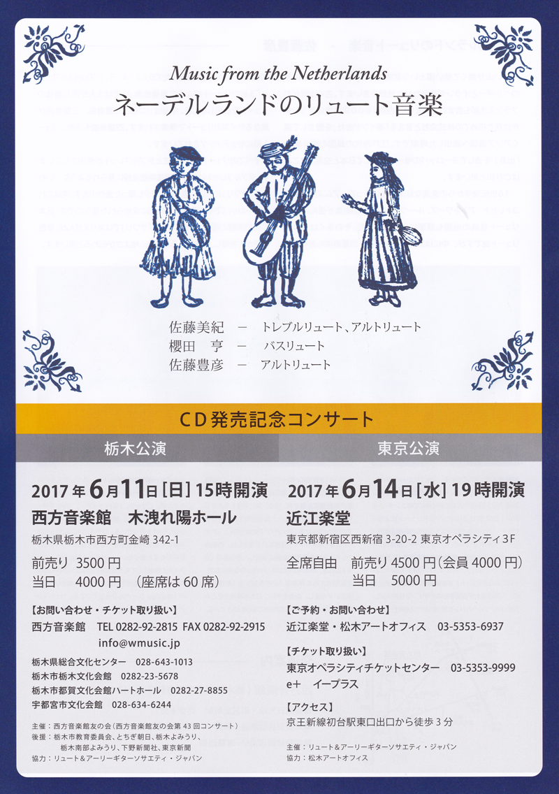 このすべてを演奏するわけではありませんが、CD発売記念コンサートなのでこの中から演奏します。世界的なリュート奏者の佐藤豊彦氏による演奏だけでなく解説、お話もあります。