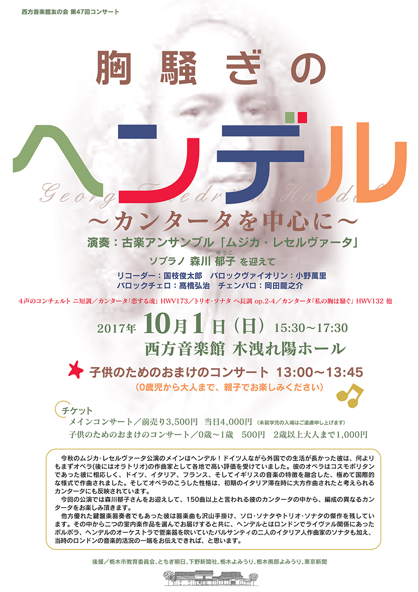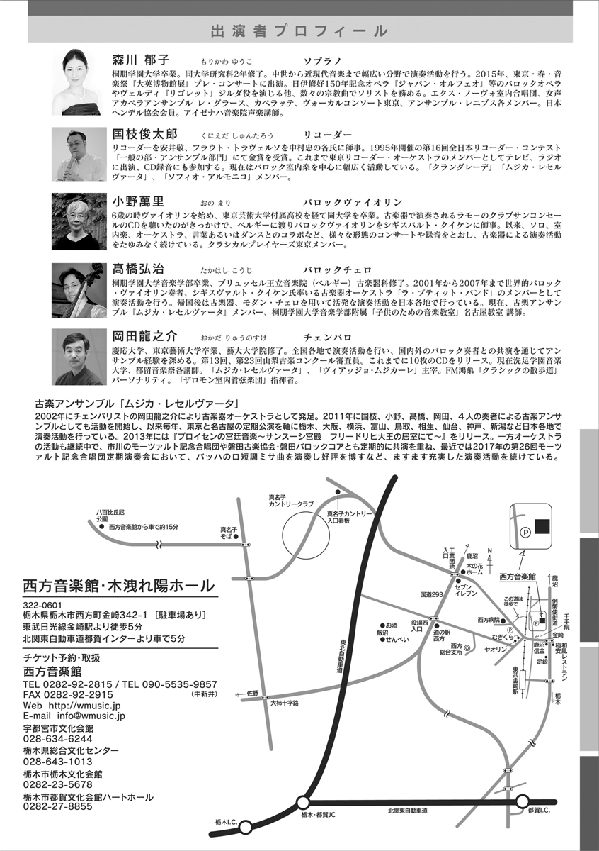 | 内容 | 演奏:古楽アンサンブル「ムジカ・レセルヴァータ」 ソプラノ 森川 郁子(ゆうこ)を迎えて リコーダー:国枝俊太郎 バロックヴァイオリン:小野萬里 バロックチェロ:高橋弘治 チェンバロ:岡田龍之介 |