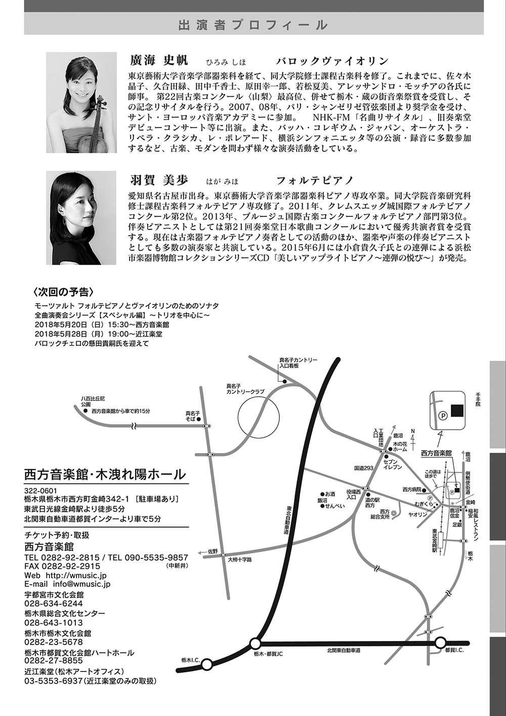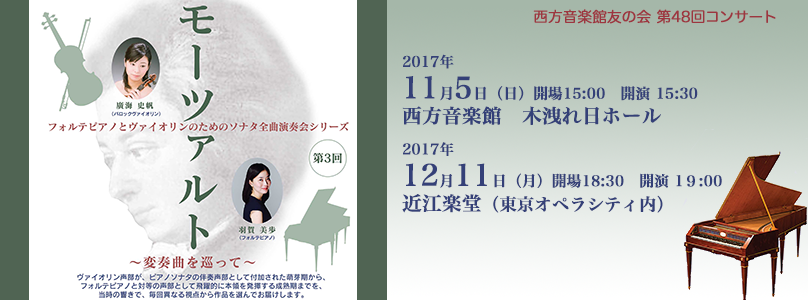| 場所日時 | 2017年11月5日(日) 開場15:00 開演15:30 場所:西方音楽館 木洩れ陽ホール 2017年12月11日(月) 開場18:30 開演19:00 場所:近江楽堂(東京オペラシティ内) |