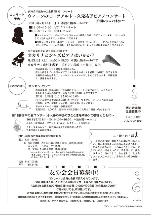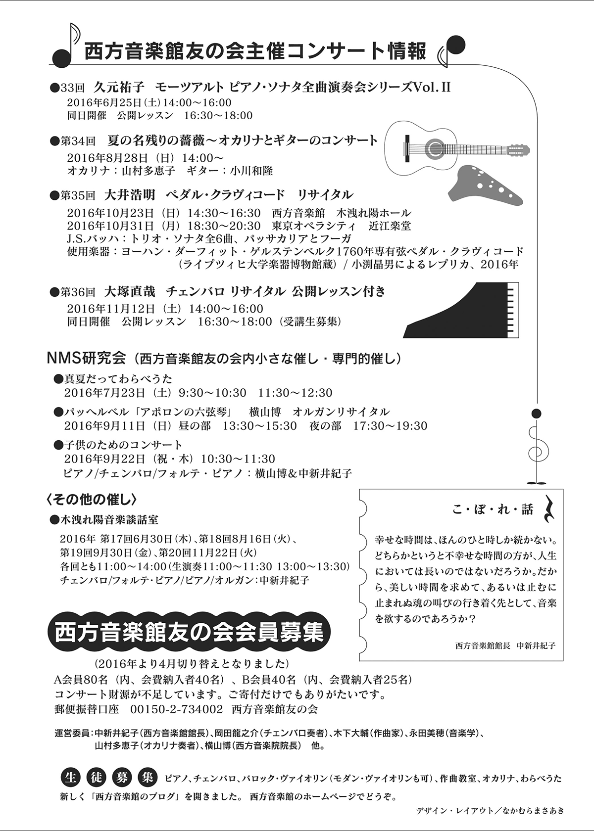 この2つのホールで、西方音楽館は新たな出発を始めます。コンサートや講習会の企画、音楽教室、わらべうた教室、貸しホールなどにより、西方町の地に根ざして、音楽文化の種撒きをしたいと思っております。