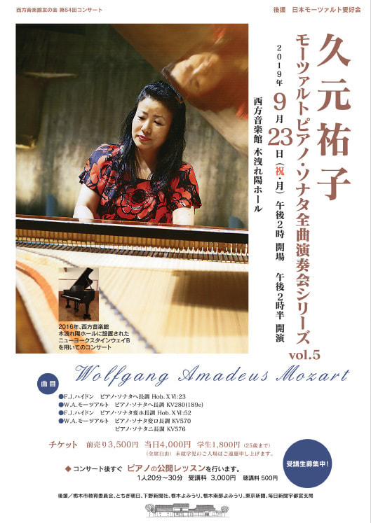 モーツァルトの専門家でもあるピアニスト久元祐子のモーツアルト ピアノソナタ 全曲演奏会シリーズの第5回目。西方音楽館常設のニューヨークスタインウェイで、正統的、かつ美しいモーツァルトの演奏をお楽しみいただきます。コンサート後、いつものように公開レッスンも行います。この度は、日本モーツァルト愛好会にも、ご後援いただきました。