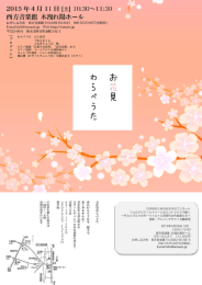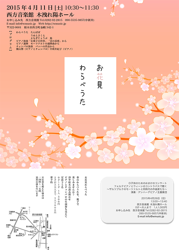 過去のコンサート&イベント 2025 2024 2023 2022 2021 2020 2019 2018 2017 2016 2015 HOME > 2015年のコンサート&イベント > お花見わらべうた2015 お花見わらべうた 春のわらべうたを、親子で 楽しみませんか?詩や絵本の読み聞かせピアノとチェンバロの生演奏も交えて 出演者 横山 博(ピアノとチェンバロ)中新井 紀子(ピアノ) 日時 2015年4月11日(土)10:30〜11:30 チケット 0歳〜1歳/お一人様¥5002歳以上から大人/お一人様1,000円 場所 西方音楽館 木洩れ陽ホール プログラム わらべうた たんぽぽうめとさくらよもぎじょうぶ 他ピアノ独奏「お菓子の世界」「音の星座」からピアノ連弾 モーツアルトの連弾曲からチェンバロ独奏 バッハの作品から お申込み ■西方音楽館TEL:0282-92-2815 篤志の方々のご寄付により、フォルテ・ピアノが、西方音楽館 木洩れ陽ホールに設置されました。 クリストファー・クラーク1994年製 (A.ヴァルター1795年モデル) 故小島芳子愛用の名器 まず、西方音楽館 木洩れ陽アップルパイ を販売します。 「3本足のルー」が完成しました。ルーが教えてくれたことは、「子供が育つ」ということ、さらに「人間が育つ」ということへの、励ましとヒントになりました。 日本モーツァルト愛好会のホームページ